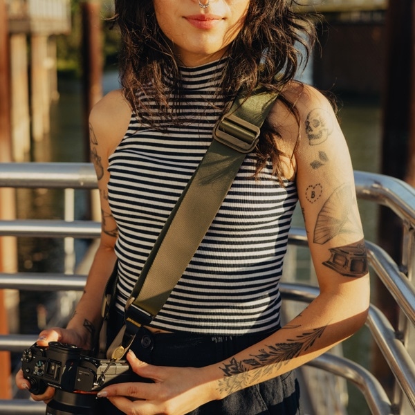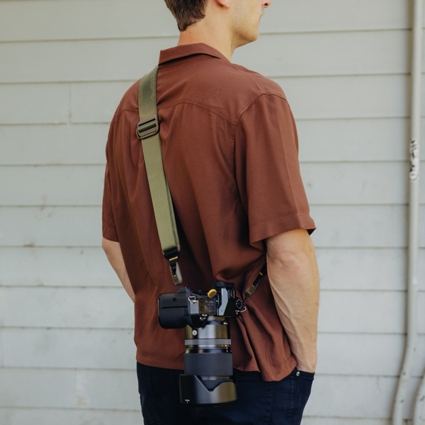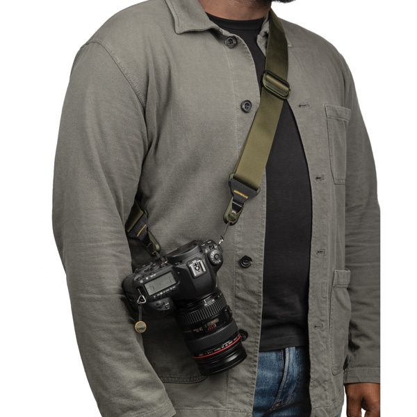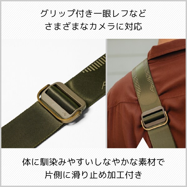 ネック部分はパッド入りで、長時間重いカメラを持ち運ぶ場合にも、負担がかかりにくい設計になっています。また、2 つのバックルはワンアクションで調節可能で、素早くストラップの長さを調整できます。