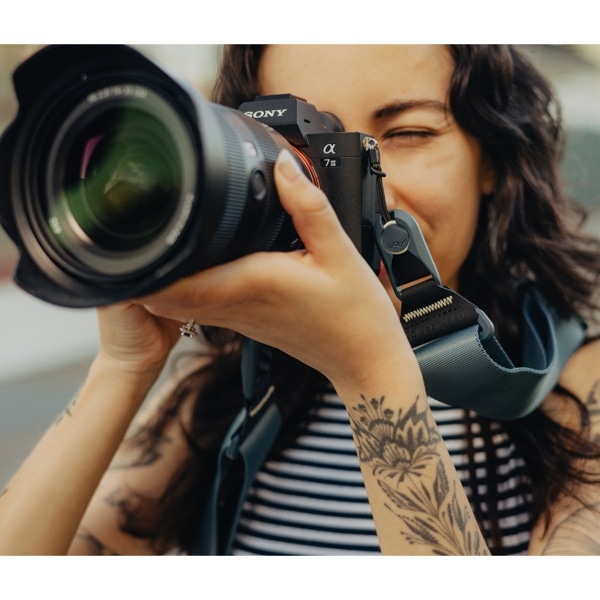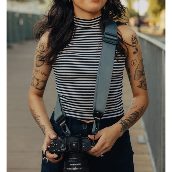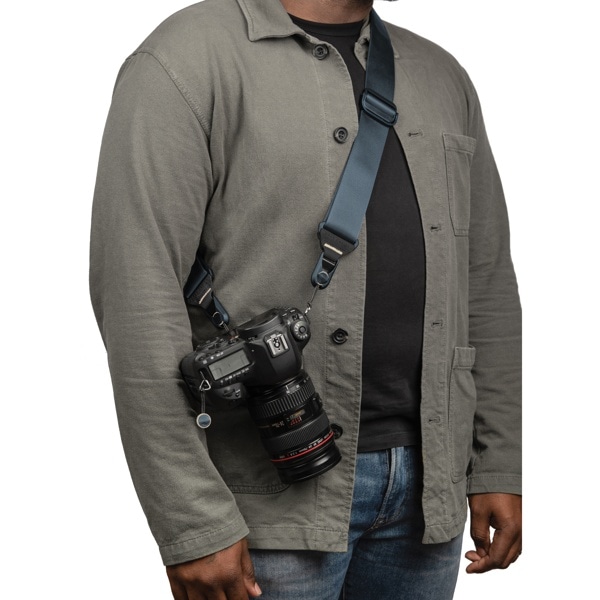 ネック部分はパッド入りで、長時間重いカメラを持ち運ぶ場合にも、負担がかかりにくい設計になっています。また、2 つのバックルはワンアクションで調節可能で、素早くストラップの長さを調整できます。