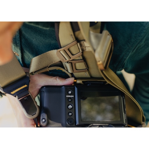 ショルダーストラップや、ウエストベストに取り付けて、カメラ本体を固定し安定させます。