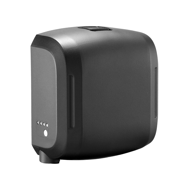 バッテリーパックは29.6V、2500mAhの大容量リチウム電池で、発光回数はフル発光で500回以上です。冷却ファンを搭載し、ハードな撮影にも対応します。着脱も簡単で、側面には分かりやすいバッテリー残量表示ランプ付きで安心です。充電時間は約90分です。Ω型の発光管と光量、色温度が調整可能なモデリングランプ
