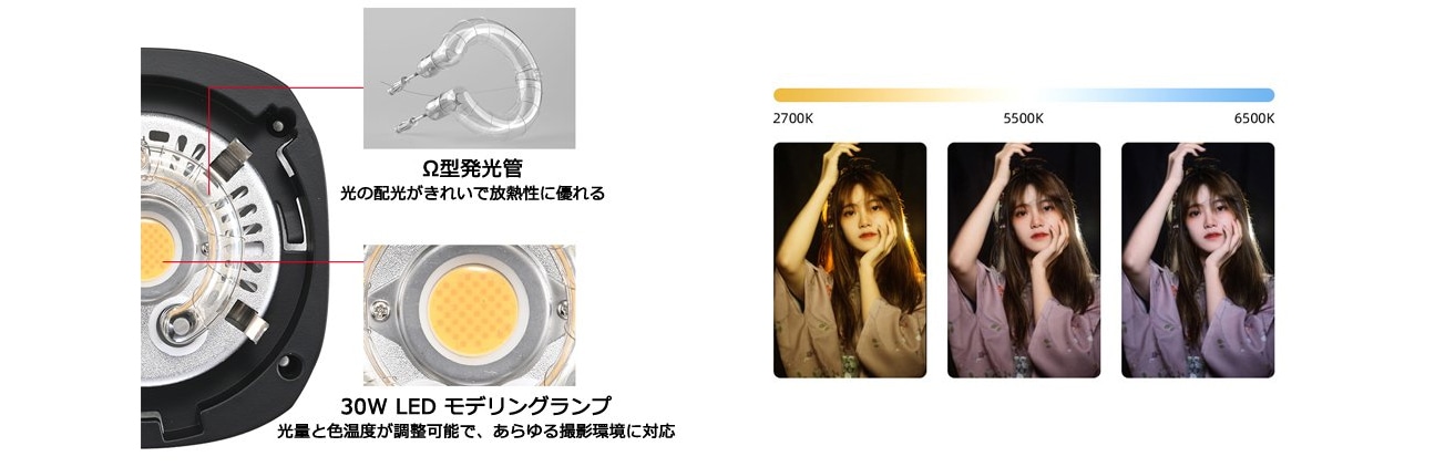 発光管は均一に広がる光の配光がきれいなΩ型で、放熱性にも優れています。また、モデリングランプは30WのLEDで、光量OFF / 1~9 / 自動調光、色温度2700~6500 Kで調整することができます。