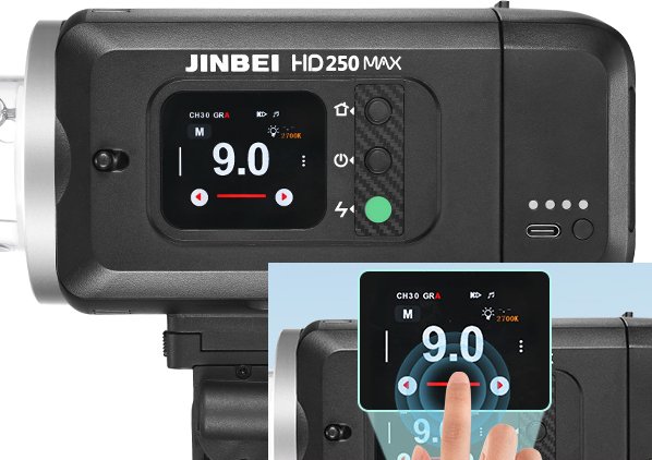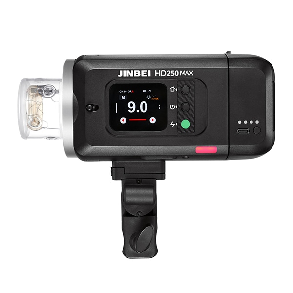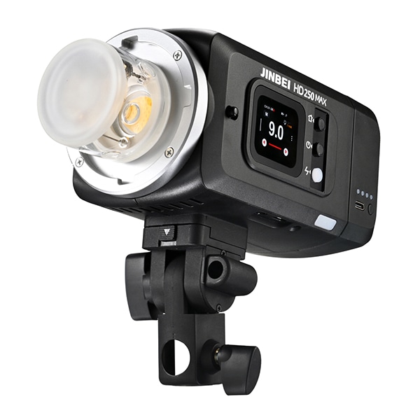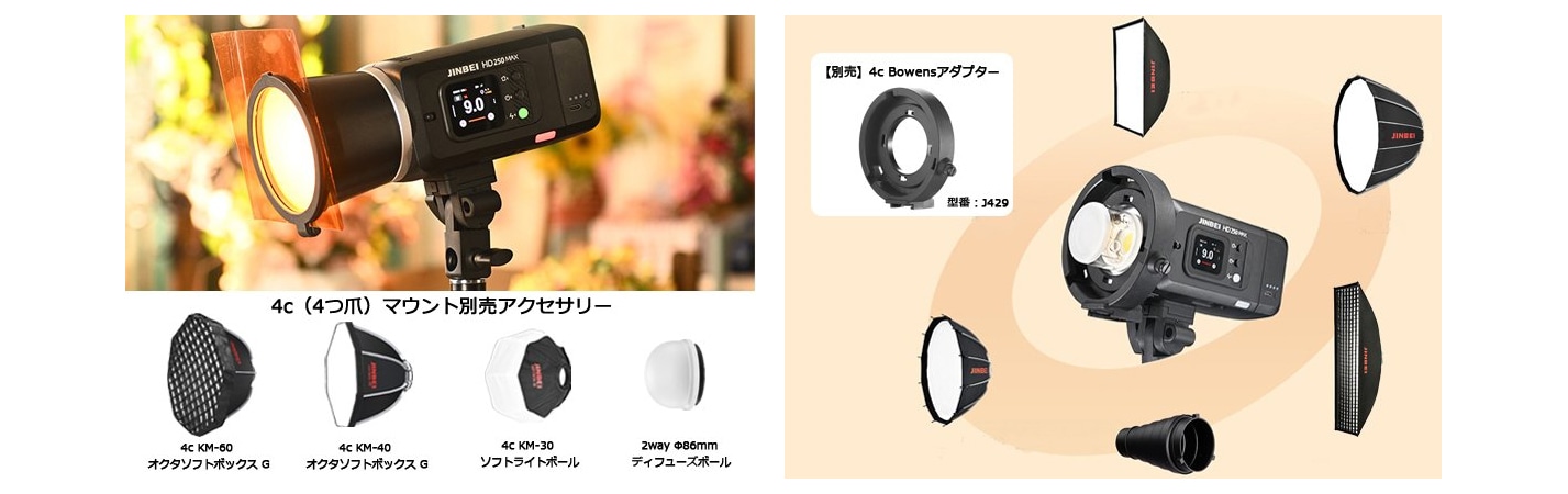 付属のクイックブラケット(角度調節部)にはΦ8mmのアンブレラシャフト受け穴も備えており、簡単にアンブレラバウンスを行うことができます。また、HD-250MAXはJINBEI独自の4c(4つ爪)マウントを採用し、そのまま取り付け可能なソフトボックスやディフューズボールなどの別売アクセサリーをご用意しています。さらに、別売の4c Bowensアダプター(型番:J429)を併用することで、4c(4つ爪)マウントからBowensマウントに変換することもできます。お手持ちまたは別売のBowensマウントアクセサリーと合わせて、より強力で指向性の高い光を表現することが可能です。