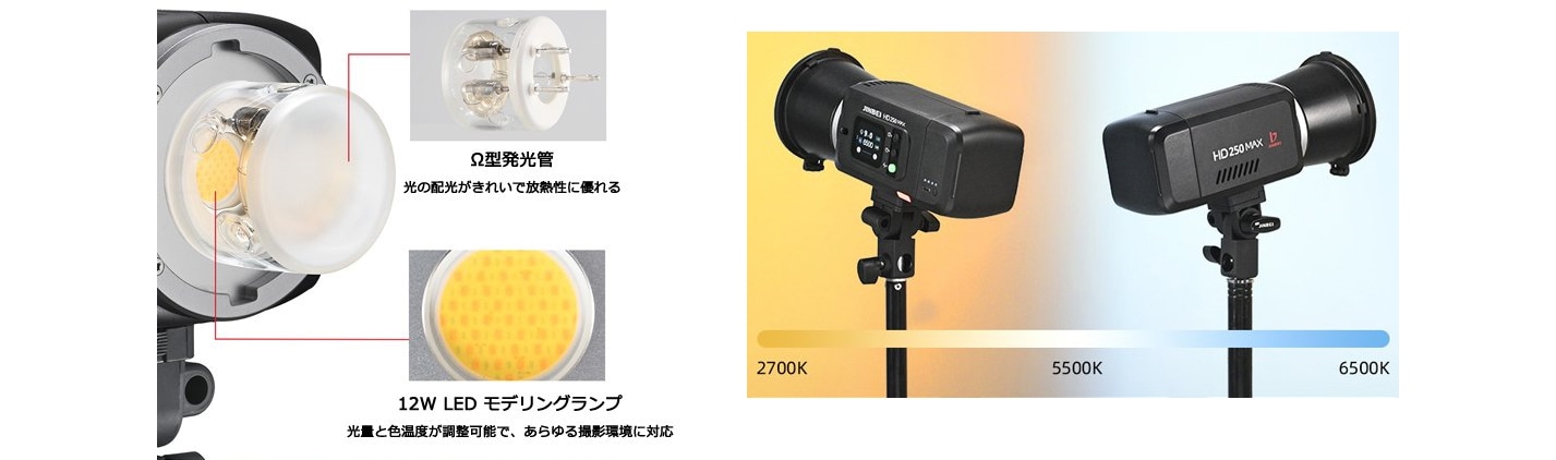 発光管は均一に広がる光の配光がきれいなΩ型で、放熱性にも優れています。また、モデリングランプは12WのLEDで、光量OFF / 1~9 / 自動調光、色温度2700~6500 Kで調整することができます。