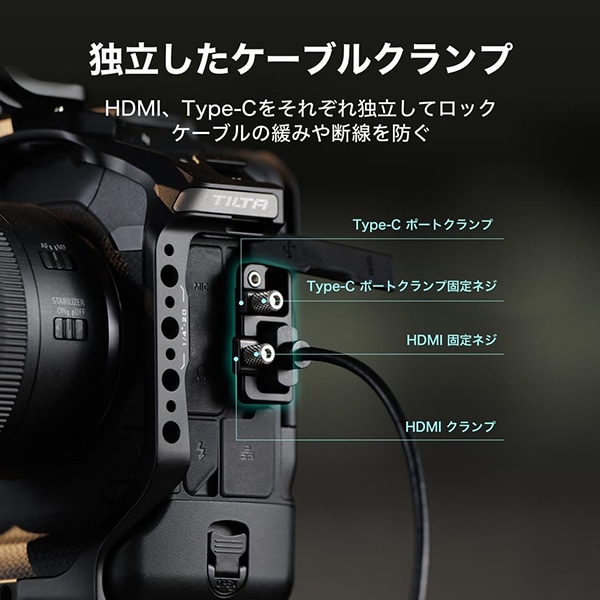 キヤノン EOS R1 フルカメラケージ用HDMI&USB-Cケーブルクランプは、フルカメラケージに専用の取付ポイントを介して簡単に装着できます。本クランプは、六角レンチでしっかりとケージに固定でき、手回しのサムスクリューにより、ケーブルの着脱も迅速に行えます。1つのクランプでHDMIケーブルとUSB-Cケーブルをまとめて固定して、撮影中の断線リスクを軽減します。