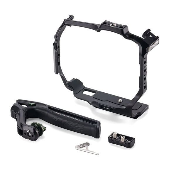 カメラボディにさらなる保護を提供しながら、さまざまなアクセサリーの取り付けを可能にする拡張性を兼ね備えています。このフルカメラケージには、コールドシューレシーバー、リストストラップマウント、位置決めピン付きの1/4インチネジ穴、3/8インチ-1/4インチ変換アダプターが装備されています。フルケージの上部には1/4インチネジ穴を備えており、そのうちの1つは3/8インチネジに変換可能です。両サイドには位置決めポイントも搭載しており、さまざまなタイプのハンドルを取り付けることができます。