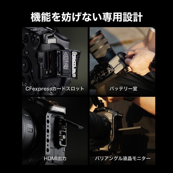 ・Canon R1カメラボディ専用設計・カメラケージ、トップハンドル、HDMIおよびUSB-Cケーブルクランプが付属