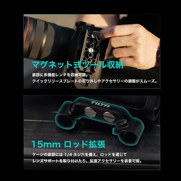 柔らかいシリコンパッドと複数の接点が、カメラとケージのしっかりとした固定を実現。アクセサリーを取り付けるための堅固な基盤として機能します。組み立てや分解が簡単に行える、マグネット内蔵の便利なツールを内蔵。