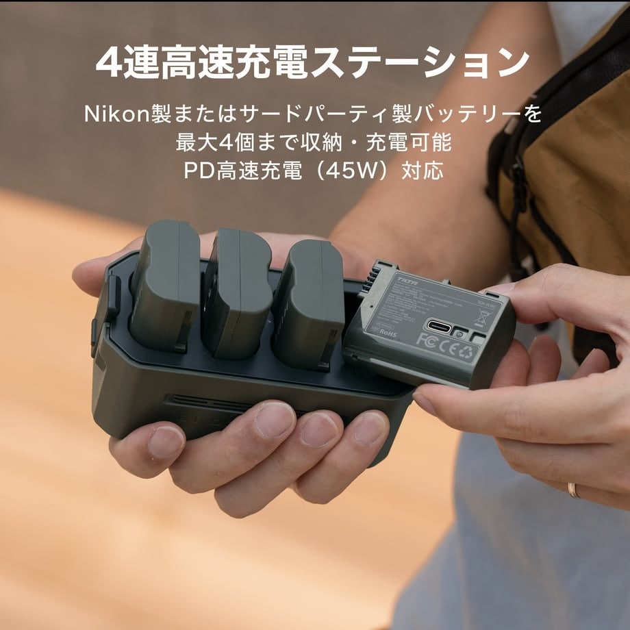 このコンパクトなEN-EL15用4連充電器は、Nikon純正およびほとんどのサードパーティ製EN-EL15バッテリーをサポートするように設計されており、4つのスロットで簡単に充電と保管ができます。軽量設計により重量はわずか172gなので、持ち運びも簡単です。