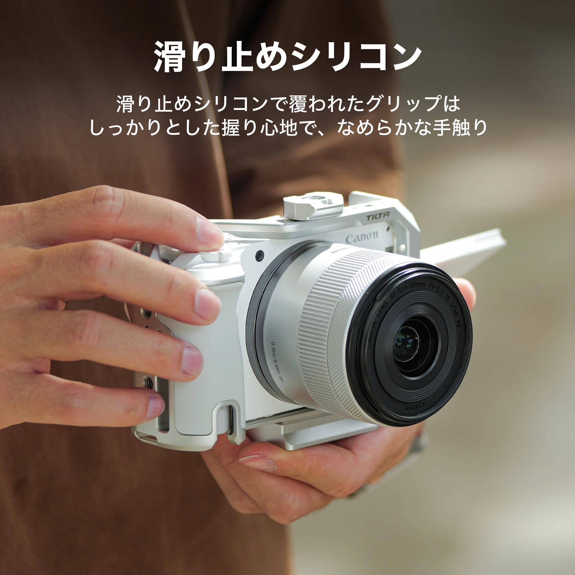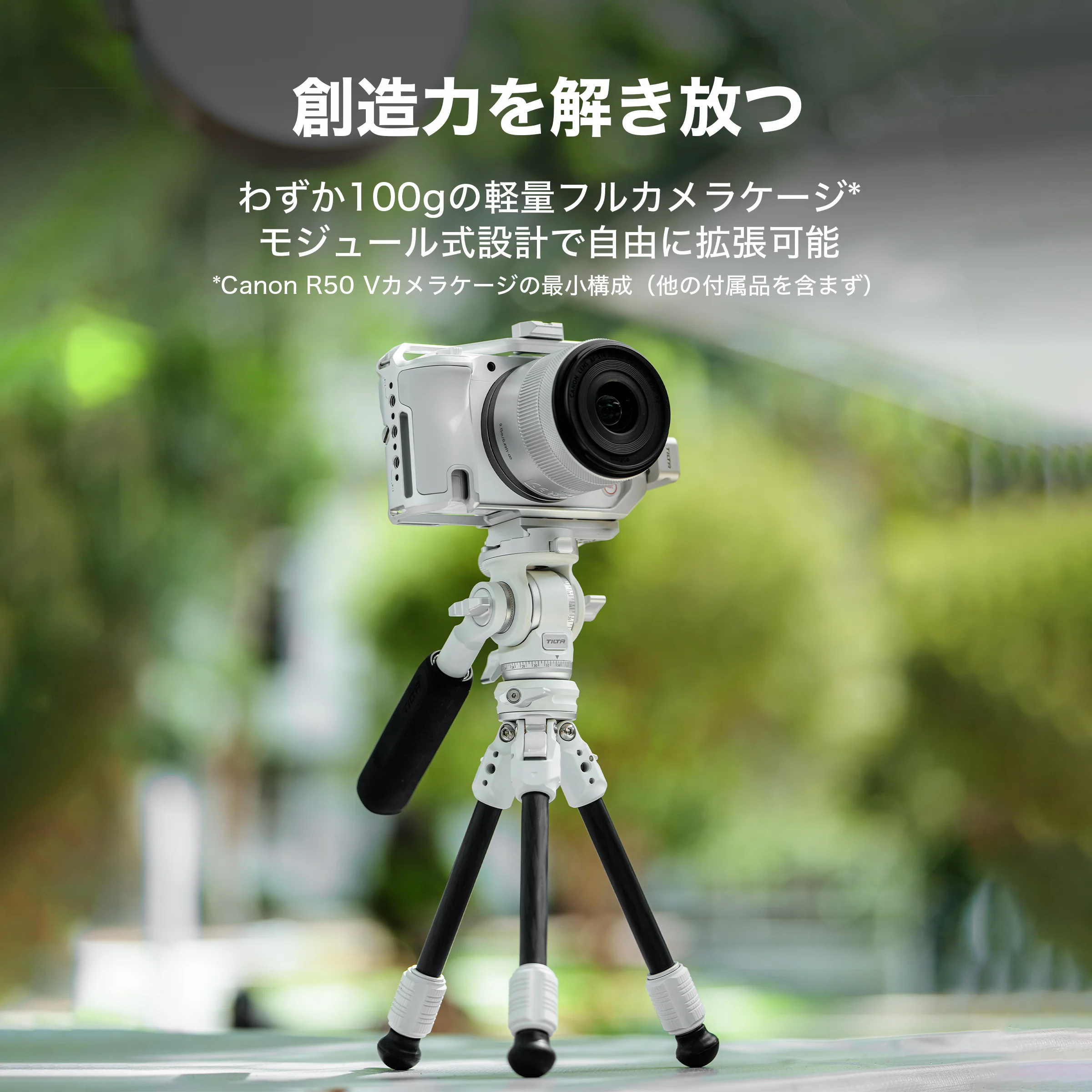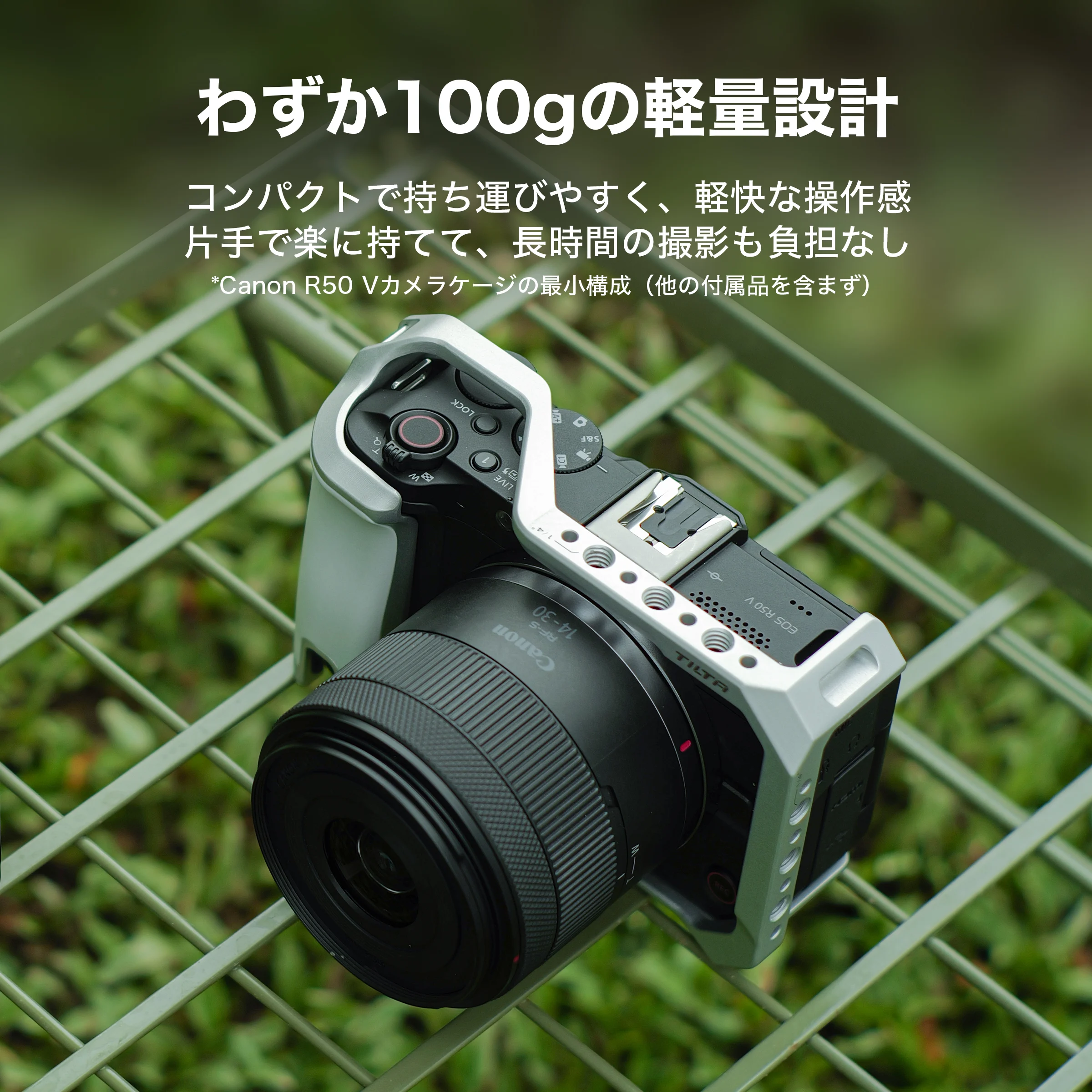 キヤノン EOS R50 V用カメラケージ ベーシックキットには、フルカメラケージとトップハンドルが含まれます。わずか約100gと軽量で、コンパクトかつ持ち運びやすいフルケージ。軽快な操作感を損なうことなく、機動力を発揮します。