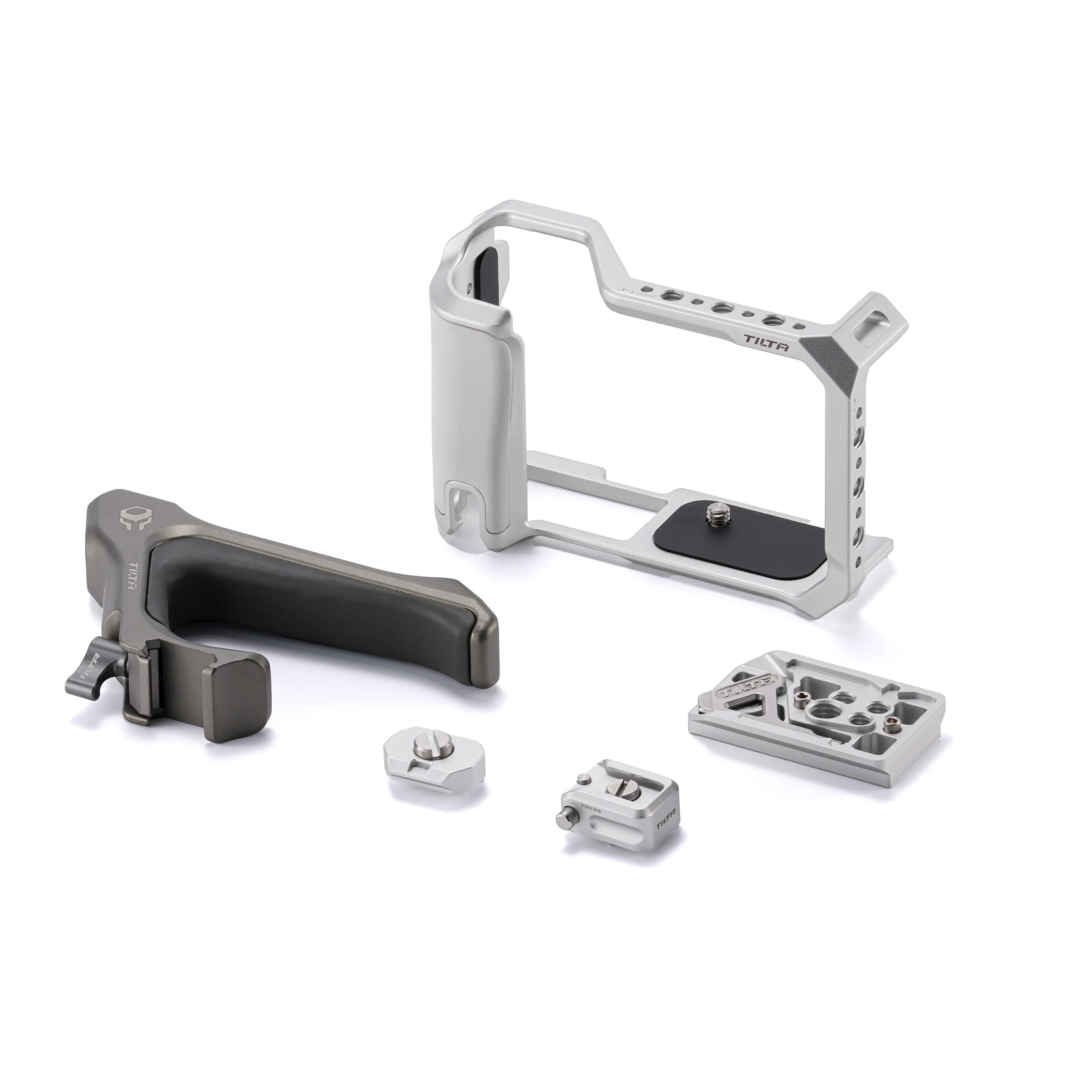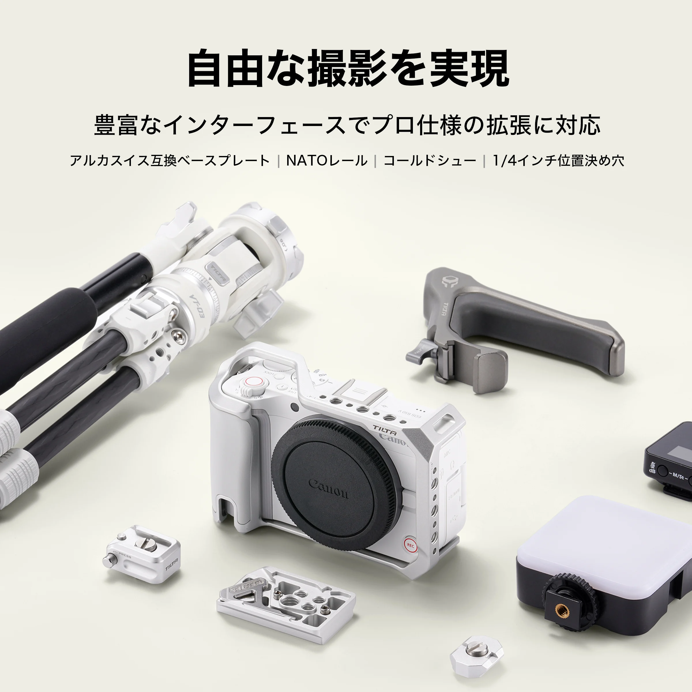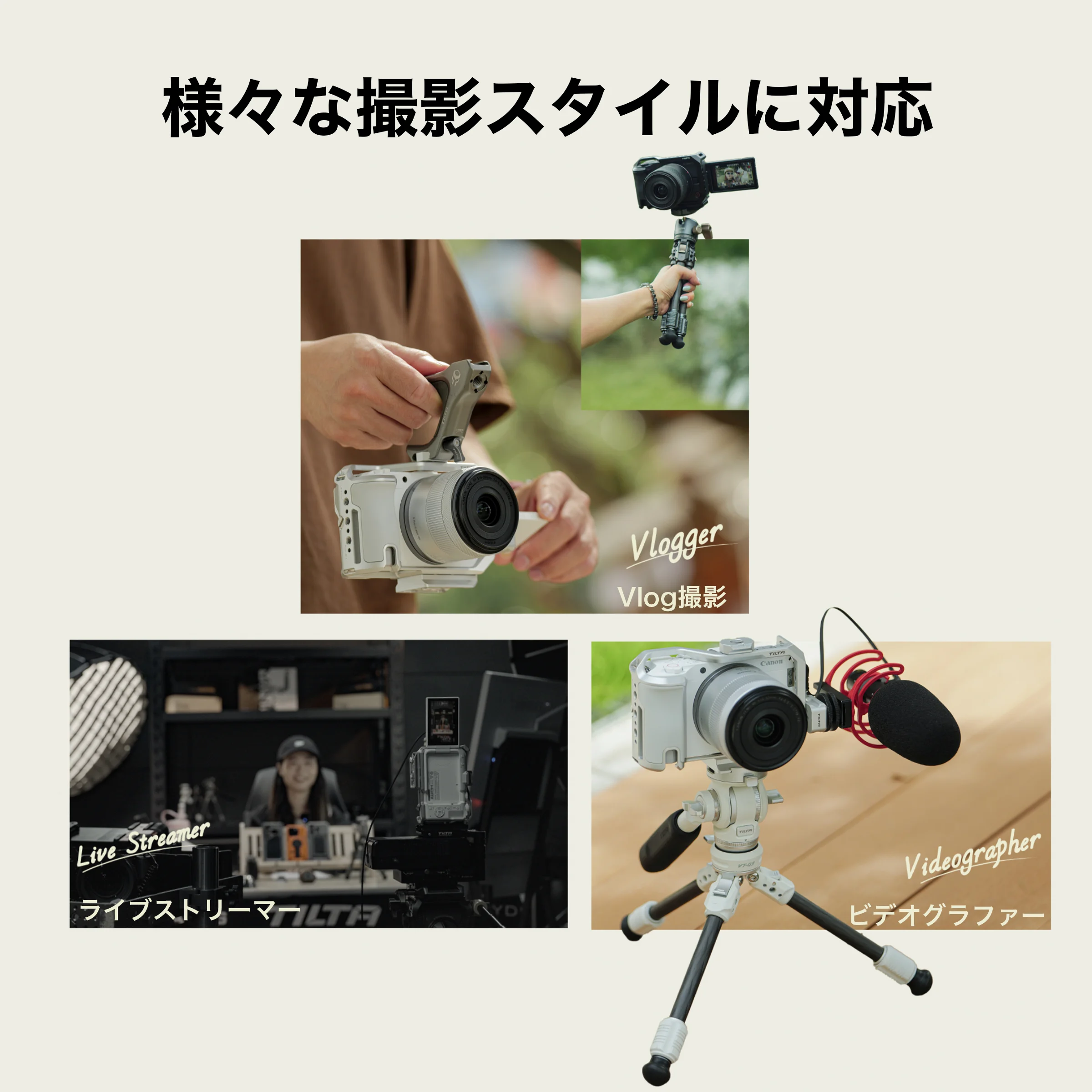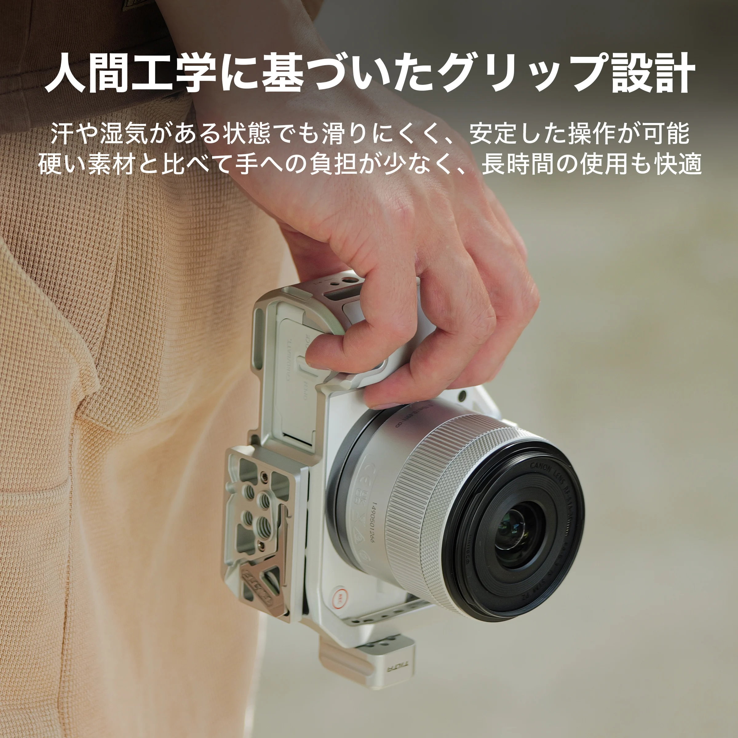 キヤノン EOS R50 V用カメラケージ ベーシックキットには、フルカメラケージとトップハンドルが含まれます。わずか約100gと軽量で、コンパクトかつ持ち運びやすいフルケージ。軽快な操作感を損なうことなく、機動力を発揮します。
