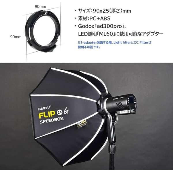 SMDV G1-adapterは、「Flip Beauty20」および「Speedbox-Flip Gシリーズ(20, 24, 28, 32)」と互換性のあるアダプターです。本製品は、Godox AD300ProおよびML60に対応しています。