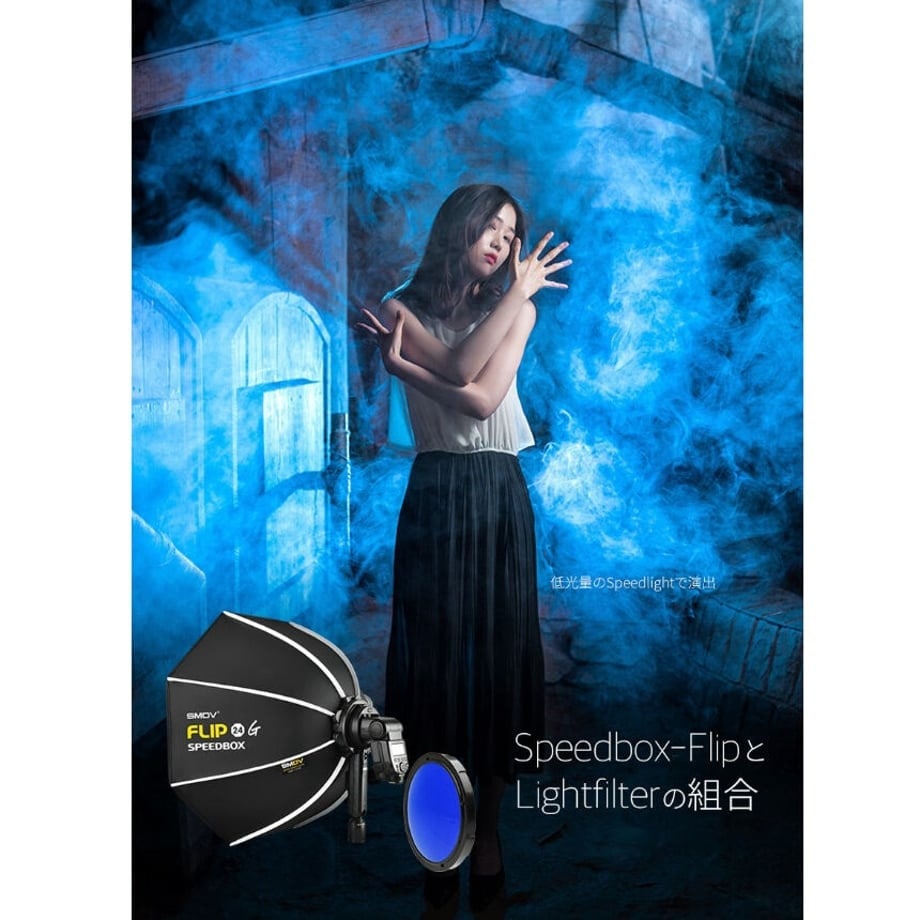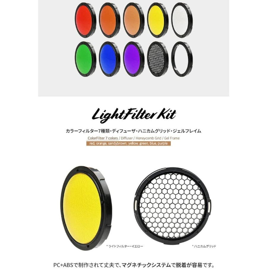 カラーフィルターKIT (Speedbox-Flip Mount専用) は、カラーフィルター7種、ディフューザー、ハニカムグリッド、ジェルフレイムの合計10点がセットになったお得なセットです。