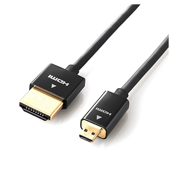 ケーブル直径約3.2mmで取り回しがしやすく、すっきり配線できる、スーパースリムタイプのイーサネット対応ハイスピードHDMIケーブルです。HIGH SPEED with Ethernet認証済み製品です。ハイビジョン対応の液晶テレビ、プラズマテレビ、プロジェクターなどのHDMI入力端子(Type A)付きの機器と、デジタルカメラ、スマートフォン、タブレットなどのHDMI-micro出力端子(Type D)を持つ機器を接続できます。