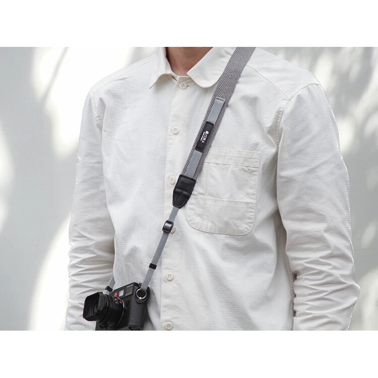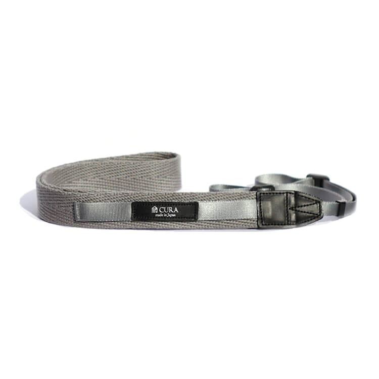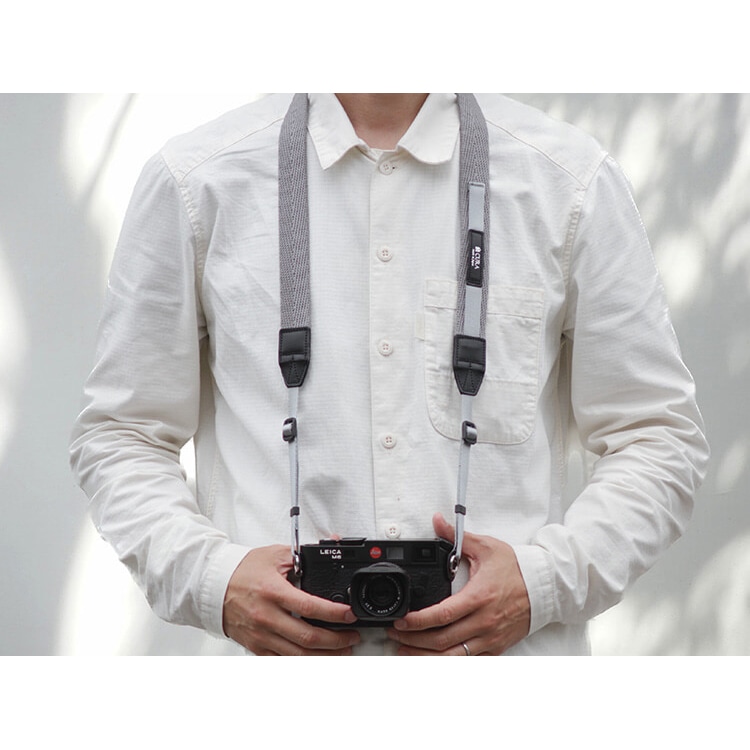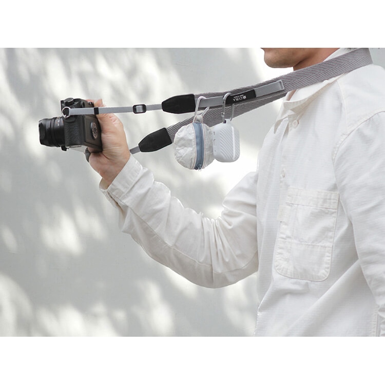 あえて左右非対称にしたデザインは蔵CURAからのカメラストラップの新しい提案です。2種のテープはスリット構造になっていて“何かに活用できる”ようになっています。