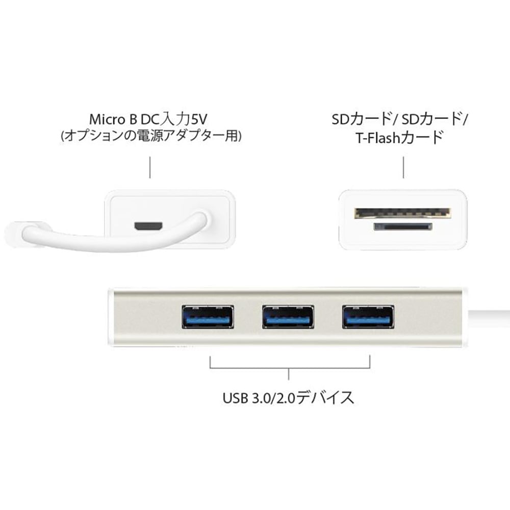 USB 3.1 Type-C 3ポートUSB 3.0ハブはお使いのコンピューターの接続機能を拡張します。ポケットサイズのマルチアダプターはコンピューターの周辺機器用にUSB 3.1/3.0/2.0ポートを3台追加し、USB Type-Cポートを通じてSD/MicroSDを接続できます。