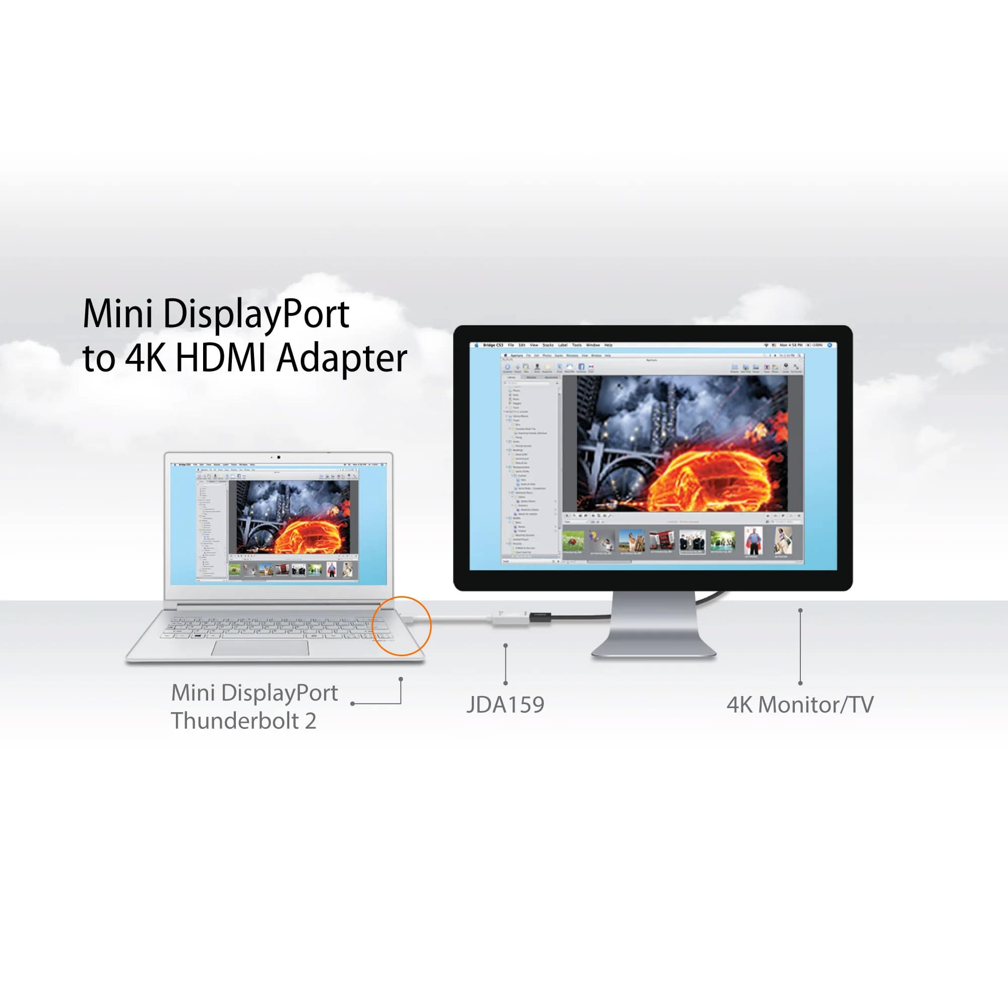 ・PCのミニディスプレイポートと4K対応モニターを接続、超高精細な画像を表示可能。
