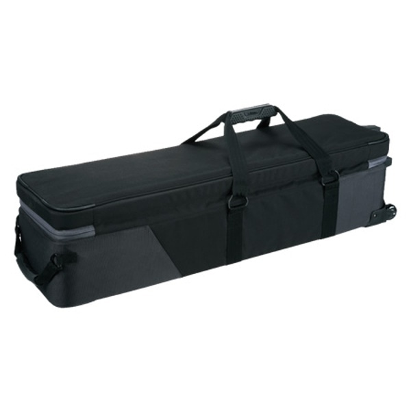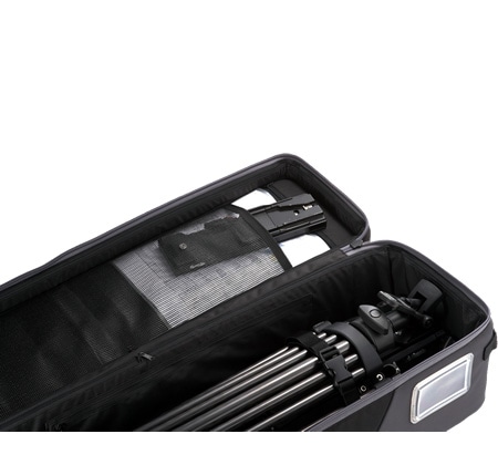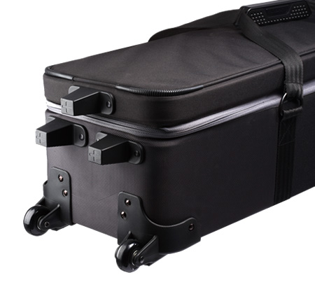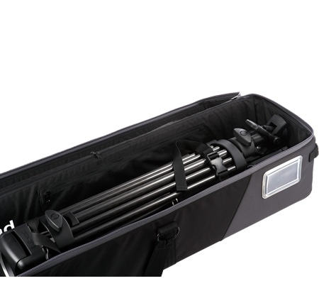 底面に2輪キャスターが取り付けられており、上面のサイドハンドルグリップからケースを引いて運ぶことができます。また、ケースの内面全てにプロテクションをほどこし、三脚固定ストラップも搭載。そのため、運搬時の衝撃吸収に優れています。フライトでの機内預入も可能な堅牢性を備えたマルチ三脚ケースです。