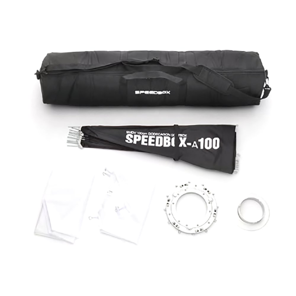 SPEEDBOXアルミリング本体、スピードリング、インサート金具、中間ディフューザー、前面ディフューザー、収納バッグ(ベルト付き)※モデリングランプは、ハロゲンランプ200W未満、ストロボ出力400Ws未満でご使用ください。