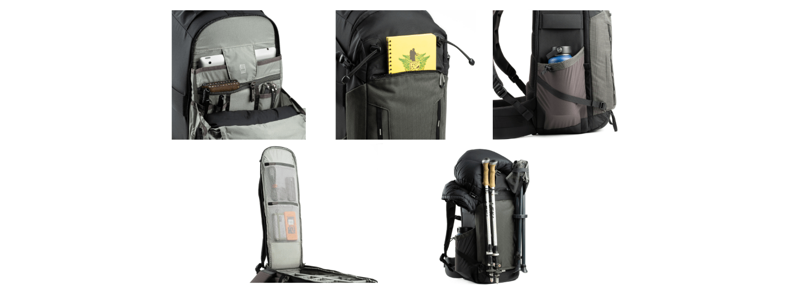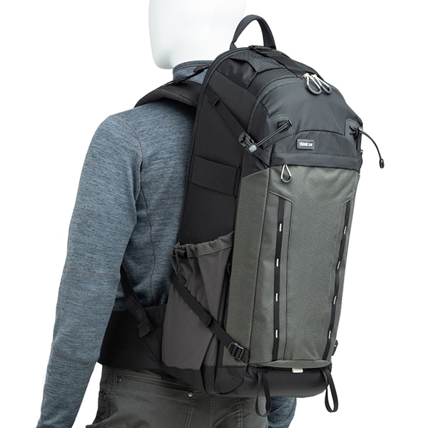 バッグの両サイドにはシンクタンクフォト製のポーチ(別売り)などを取り付けられるアタッチメントを装備。ショルダーストラップとフロントにはデイジーチェーンやトレッキングポール / アックス用ループが設けられ、持ち運べる荷物の容量を拡張できます。両サイドのコンプレッションストラップにはサイドリリースバックルが付き、追加のラッシングポイントとしても活用できます。