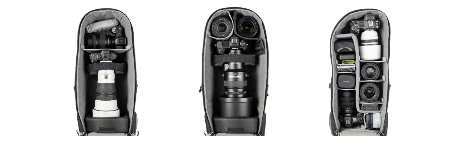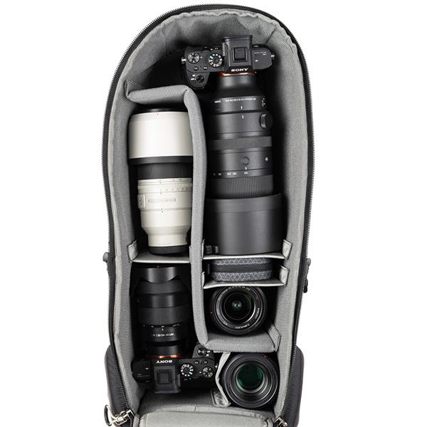 メインコンパートメント内には大型レンズとグリップ付き一眼レフ用の、ピローなどを組み合わせたディバイダーや、5-6本程度のレンズとグリップ付き一番レフ用のディバイダーなどが付属します。