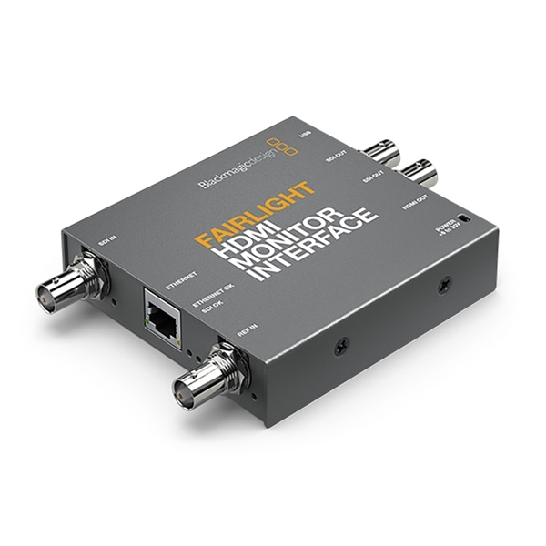Fairlightコンソールのコンポーネントを自分独自のデスクの一部として、HDMIモニターと共に使用している場合、Fairlight HDMI Monitor Interfaceを使用することで、Fairlight Console Channel Controlからのグラフィックを生成できます!このコンパクトなコンバーターは、HDMIモニターの後ろに収まるサイズで、FairlightコンソールのイーサネットデータをHDMIに変換します。