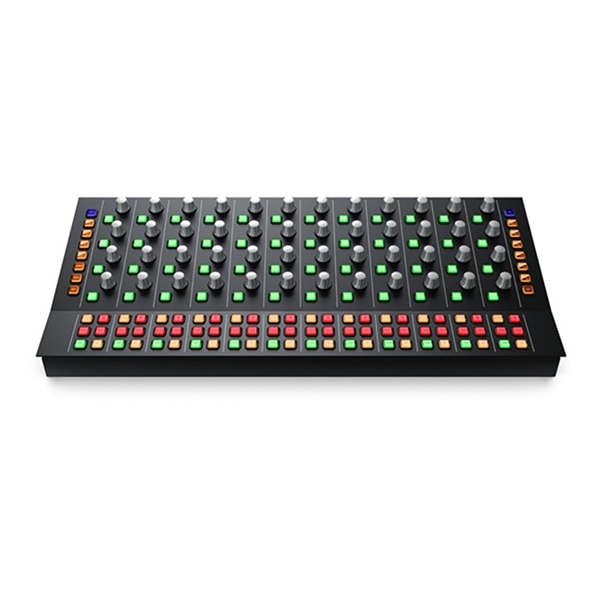 Fairlight Console Channel Controlは、チャンネルフェーダーの機能を拡張できる多機能パネル。12グループのタッチセンサー式コントロールノブと発光ボタンを搭載しており、単一のチャンネル、12の隣接するフェーダーチャンネル、マスターバスのいずれかに割り当てられます。