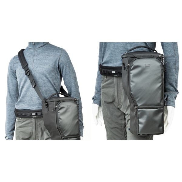 また、ショルダーストラップを使用してショルダーバッグとして使うのはもちろん、ストラップを取り外し、背面のベルト用パススルーにベルトを通してウエストバッグとしても使用できます。サイドには、別売りのシンクタンクフォト製モジュラーポーチを取り付けられます(※)。