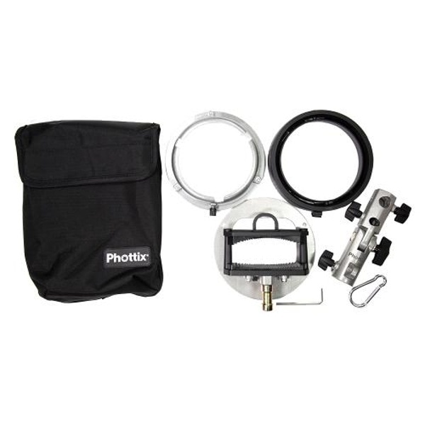 スピードライトにソフトボックス等のアクセサリーを手軽に装着できるマルチマウント「Cerberus」(サーベラス)と前後180度段階的に角度調整ができ、アンブレラ装着も可能な「Varos Pro」(バロスプロ)がセットになった製品です。既発売しております、Phottix ソフトボックス「Raja Quick-Folding」シリーズなど、様々なBowensマウントのアクセサリー にご使用いただけます。