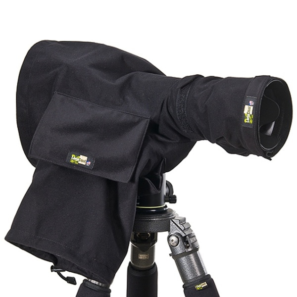 望遠レンズに、カメラボディを付けた状態ですっぽり覆えるレインコートです。雨や雪だけでなく、砂や潮風が吹くような環境でも大切なカメラとレンズを守ります。リアルツリー柄などの軽量な防水生地(ポリエステルトリコット)の縫製部分には裏側にカラーシームテープが貼られて防水性に留意しています。また別売アイピースが不要なので、手軽にお使いいただけるのもポイントです。本体背面( カメラ液晶面) はドローコードで縛ってアイピースだけ出したり、あるいは液晶全体を確認できます。フード先端部裏側にはラバーが貼られてレンズへの食いつきと安定性に優れており、レンズ長に合わせて生地を畳んで留めておくストラップが付属し快適な使用感を実現しました。使用後は冷水ですすぎ洗い、吊り干しして乾燥してから畳んで収納して下さい。