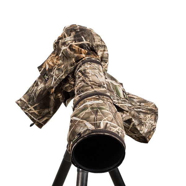望遠レンズに、カメラボディを付けた状態ですっぽり覆えるレインコートです。雨や雪だけでなく、砂や潮風が吹くような環境でも大切なカメラとレンズを守ります。リアルツリー柄などの軽量な防水生地(ポリエステルトリコット)の縫製部分には裏側にカラーシームテープが貼られて防水性に留意しています。また別売アイピースが不要なので、手軽にお使いいただけるのもポイントです。本体背面( カメラ液晶面) はドローコードで縛ってアイピースだけ出したり、あるいは液晶全体を確認できます。フード先端部裏側にはラバーが貼られてレンズへの食いつきと安定性に優れており、レンズ長に合わせて生地を畳んで留めておくストラップが付属し快適な使用感を実現しました。使用後は冷水ですすぎ洗い、吊り干しして乾燥してから畳んで収納して下さい。
