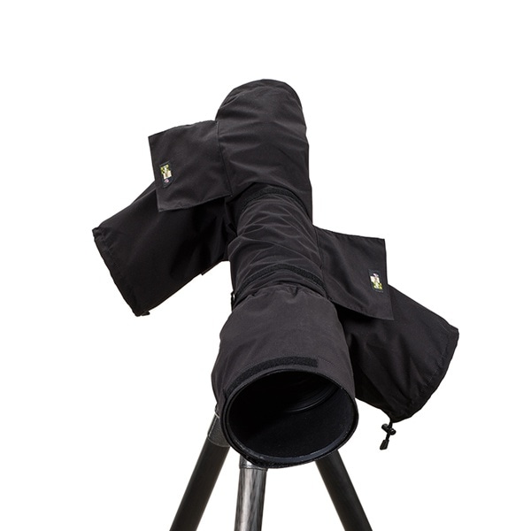 望遠レンズに、カメラボディを付けた状態ですっぽり覆えるレインコートです。雨や雪だけでなく、砂や潮風が吹くような環境でも大切なカメラとレンズを守ります。リアルツリー柄などの軽量な防水生地(ポリエステルトリコット)の縫製部分には裏側にカラーシームテープが貼られて防水性に留意しています。また別売アイピースが不要なので、手軽にお使いいただけるのもポイントです。本体背面( カメラ液晶面) はドローコードで縛ってアイピースだけ出したり、あるいは液晶全体を確認できます。フード先端部裏側にはラバーが貼られてレンズへの食いつきと安定性に優れており、レンズ長に合わせて生地を畳んで留めておくストラップが付属し快適な使用感を実現しました。使用後は冷水ですすぎ洗い、吊り干しして乾燥してから畳んで収納して下さい。