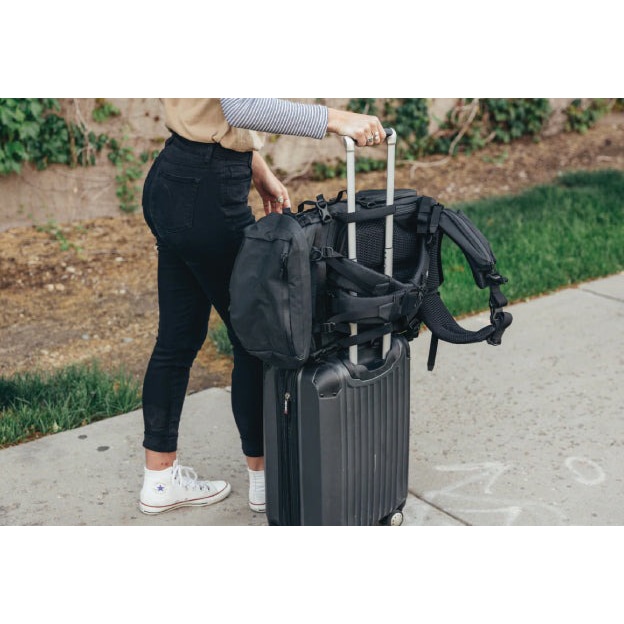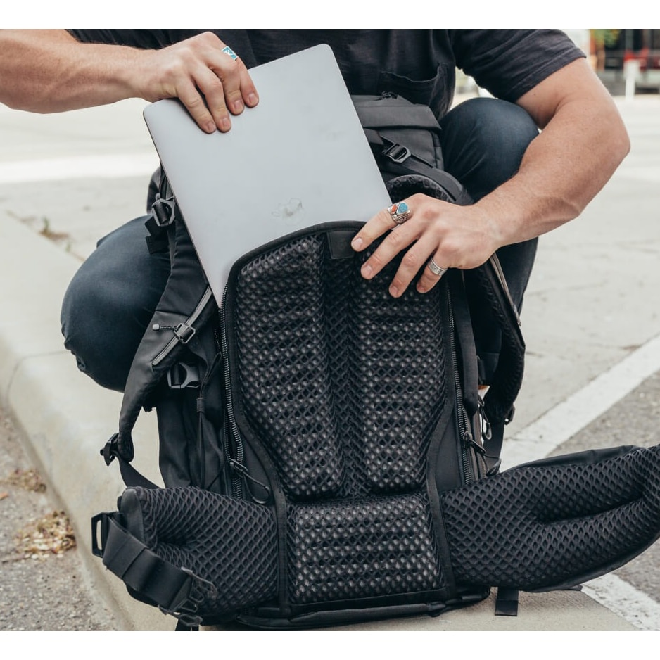 上部蓋内側やバッグ前面に加え、バックパネルをめくるとパスポート等の貴重品用ポケット、またノートPC やタブレット専用の収納部がバッグ背面内側に設置されています。ウォーターボトルや小型三脚等の収納に適したサイドポケットも備わり、収納力だけでなく利便性にも富んでいます。ほかにも複数のポケットが各所に付いています。