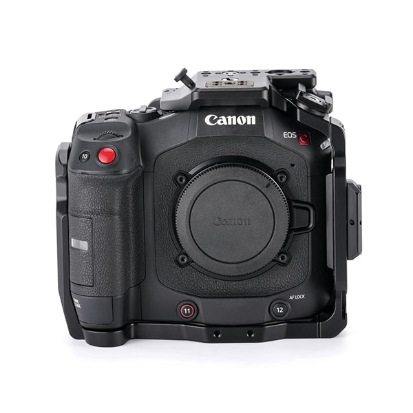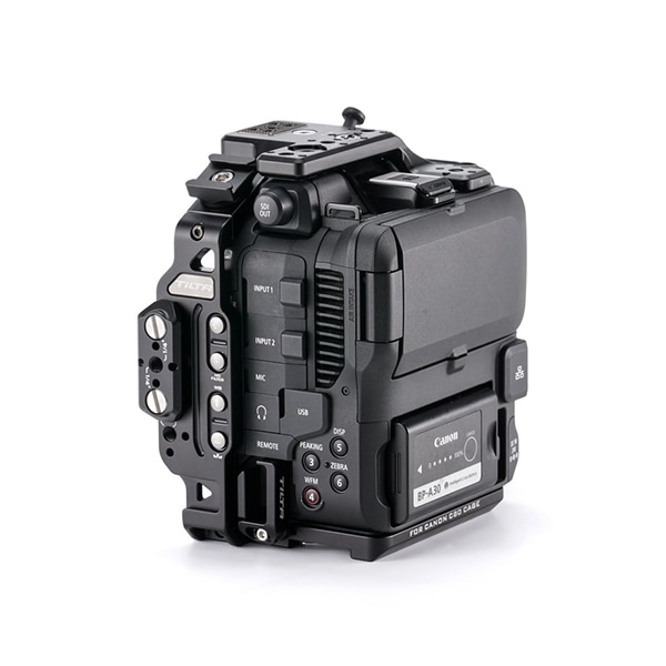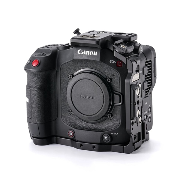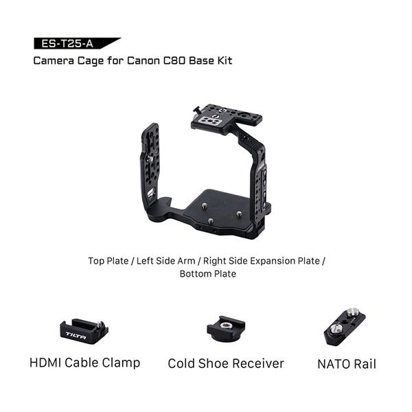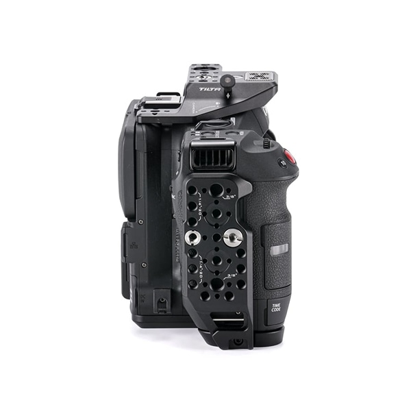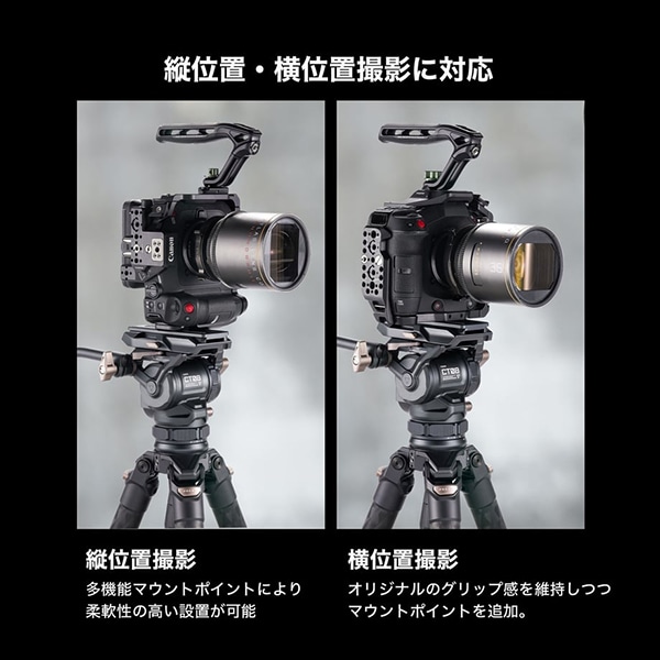 フルケージには、コールドシューレシーバー、NATOレール、ランヤードホルダー、1/4"-20 & 3/8"-16ネジ穴(位置決めポイント付き)を備え、多様な撮影環境に対応。 サイドプレートは、独自のボタンエクステンション機能を搭載し、オリジナルの操作性まま正確なクリック感を再現します。反対側のサイドプレートには、クイックリリースプレートの取り付けポイントを配置し、縦位置撮影時のセットアップもスムーズに行えます。 トッププレートはC80純正トップハンドル(ハンドルユニット)を使用できるように、マウントポイントを妨げない設計。