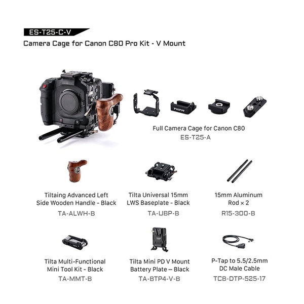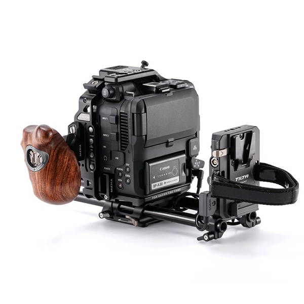 キヤノン EOS C80用カメラケージ プロキットは、フルカメラケージと木製サイドハンドル、15mmLWSベースプレート(ロッド付)、Vマウントバッテリープレートのセットです。カメラケージには、コールドシューレシーバー、NATOレール、ランヤードホルダー、1/4"-20 & 3/8"-16ネジ穴(位置決めポイント付き)を備え、多様な撮影環境に対応。サイドプレートは、独自のボタンエクステンション機能を搭載し、オリジナルの操作性まま正確なクリック感を再現します。 反対側のサイドプレートには、クイックリリースプレートの取り付けポイントを配置し、縦位置撮影時のセットアップもスムーズに行えます。