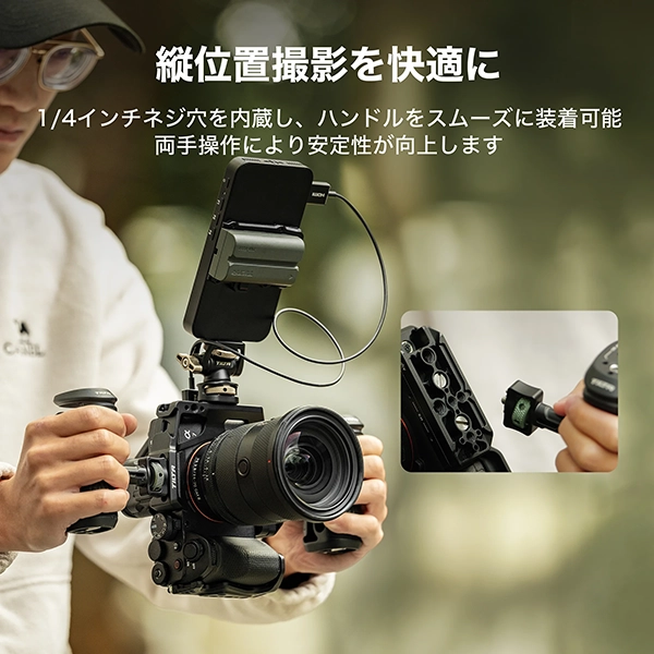 ボトムプレートの1/4”-20ネジ穴とケージ上部の1/4”-20ネジ穴にサイドハンドル(別売)を追加し、両手グリップ運用で安定性を高められます。