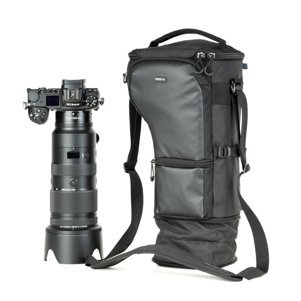 底を拡張できます。底部拡張時はグリップ付一眼レフに70-200mm F2.8を装着し、フードを順付けした状態で収納可能。