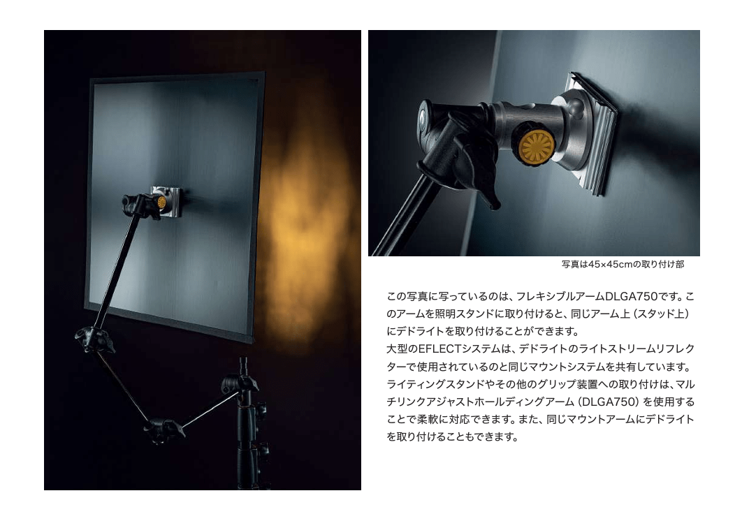 これらがシネマ、およびスティールを問わずすべてのアーティストのクリエイティブなプレゼンテーションに役立ちます。EFLECTマルチミラーはスムーズなカーブにより、繰り返しの使用にも耐える堅牢性も持ち合わせています。