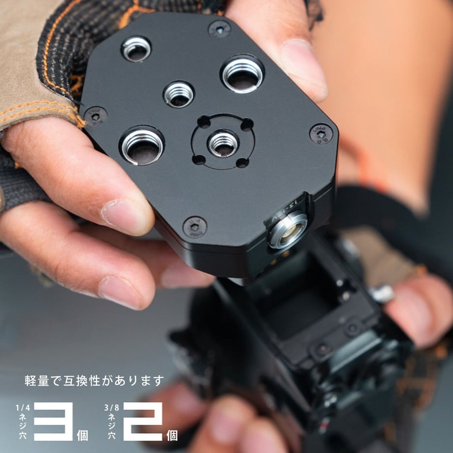 ベースプレートの下部にある1/4 "-20および3/8" -16ネジを使用すると、RS2を三脚、ジブ、スライダー、カーマウント、安定化システム、その他のさまざまなシステムに取り付けることができます。