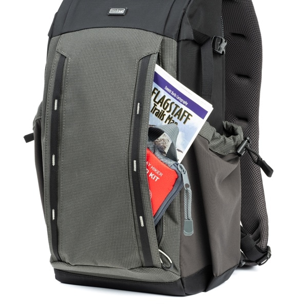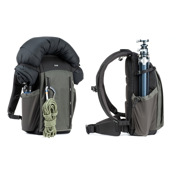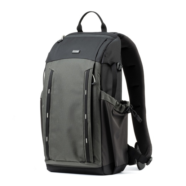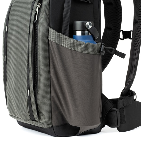 コンパクトながらも、標準ズームレンズを装着した中型一眼レフを収納でき、両サイドにはウォーターボトルや三脚を入れられるサイドポケットを備えています。