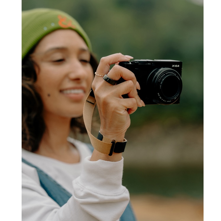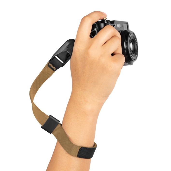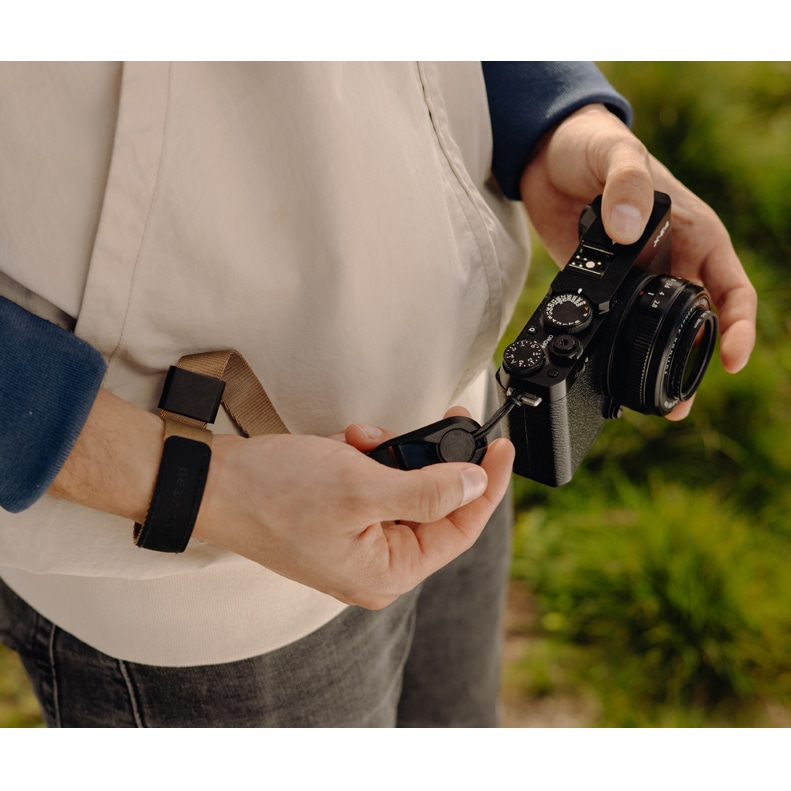 ストラップ本体は自然で馴染みの良いコヨーテカラーとブラックの組み合わせで、付属のアンカーもブラックです。日常のシーンにも、また屋外での撮影シーンにも溶け込むカラーです。