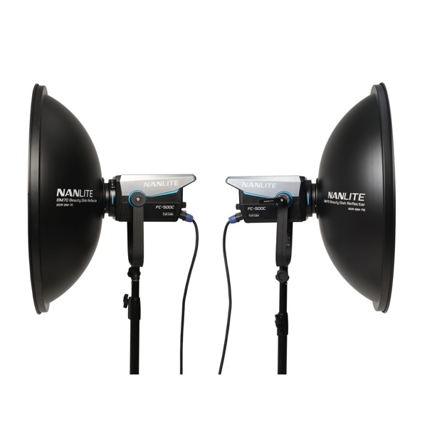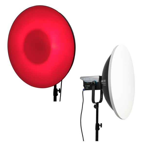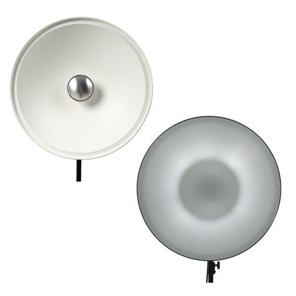 ① ビューティーディッシュリフレクターの内側にはオレンジピール加工が施されており、光を均一に反射します。光はディフレクタープレートに一度反射され、その後リフレクター内部に広がることで、集中しつつも柔らかく均一な光を生み出します。付属のディフューザーを装着することで、さらに光を柔らかくすることができます。また、丸型の開口部により、ポートレート撮影で魅力的なキャッチライトを作り出します。