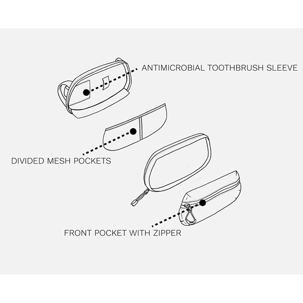 ファスナー付きのメインポケットとフロントポケットの2つのポケットで、小物類を整理して収納できます。歯ブラシなどを清潔に収納できる抗菌スリーブ付き。内側の素材にはPUコーティングが施され、清潔さを保ちます。