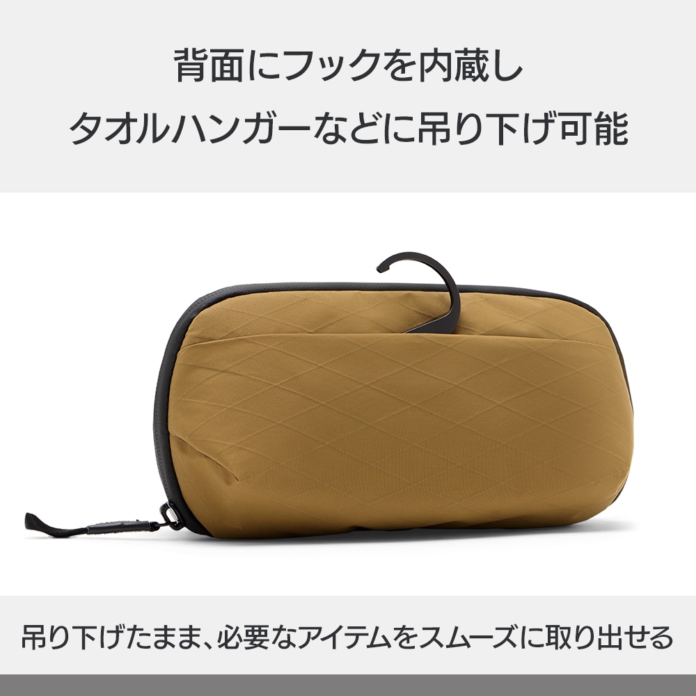 ポーチ背面には、タオルハンガーなどに吊り下げるための丈夫なアルミニウム製フックを内蔵しています。