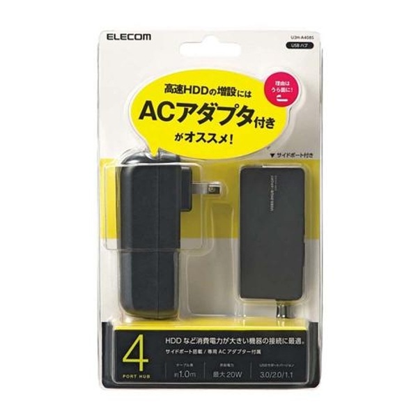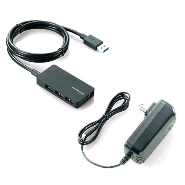 ACアダプタが付属するセルフパワー・バスパワー共用タイプのUSBハブです。収納・持ち運びに便利なケーブル一体型で、ケーブル長は、ゆったり接続できる1.0mです。セルフパワーモードで使用することで、安定した電源供給が可能です
