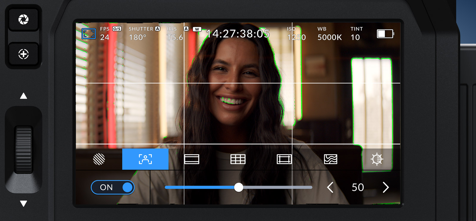 HDRディスプレイは輝度が1500nitであるため、ショットの確認や設定の変更を、明るい日光の下でも問題なく行えます。スクリーンのオーバーレイは、ステータスおよび収録パラメーター、ヒストグラム、レベル、フレームガイドなどを表示。さらに、3D LUTをすばやく適用できるため、希望のカラーとルックでショットをモニタリングできます。