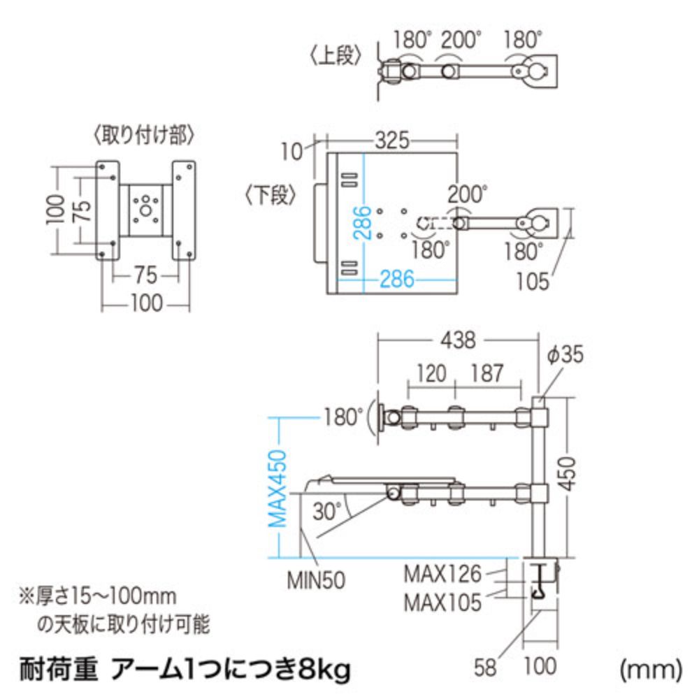 ・デスクへの取付けはクランプ式になっており、厚さ15~100mmの天板に取付けることができます。