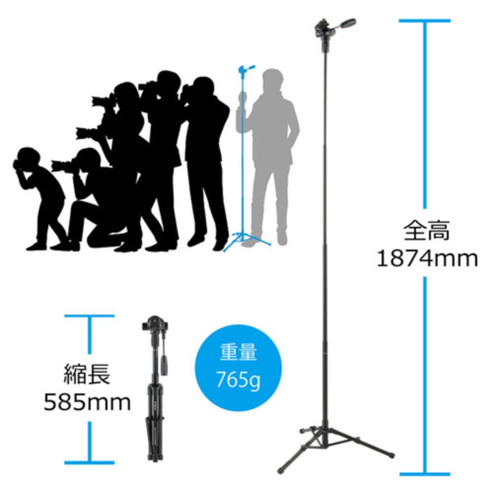 ひねって伸ばすだけの簡単操作で、狭い場所でも素早く立てられる便利なカメラスタンドです。短くたためて持ち運びも楽々。ビデオ雲台を標準装備。スマートフォンホルダーも付属しています。