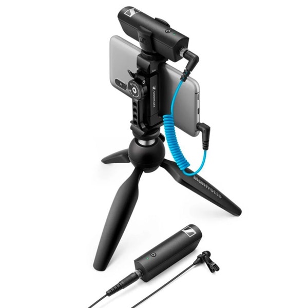 ゼンハイザーのXSW-D Portable Lavalier Set、スマートフォンクランプ、マンフロットPIXIミニ三脚で構成されたキットです。