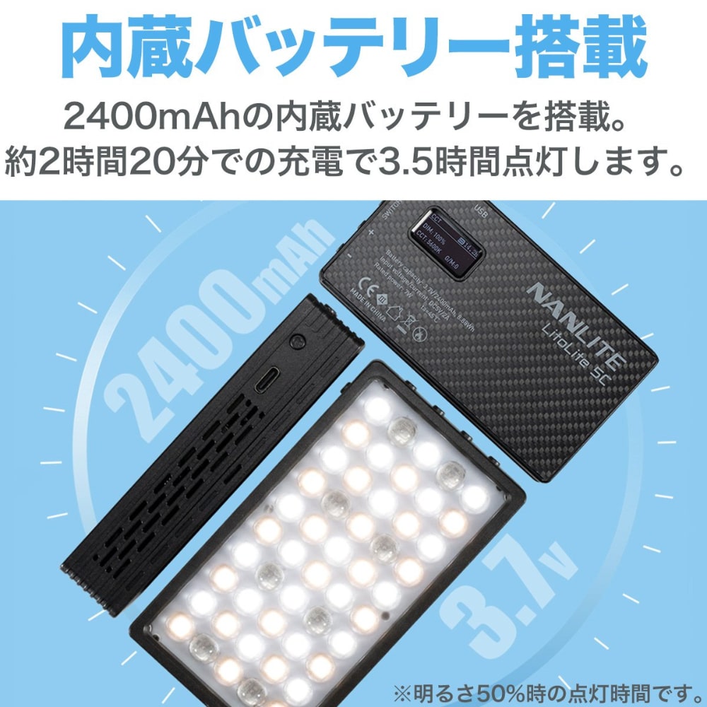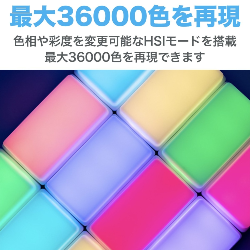 ・広いCCT範囲LitoLite 5Cは2700K~7500Kの広い色温度範囲を持ち、タングステンフィラメントランプ(3200K)及び標準的な白色光(5600K)をカバーするため、無限の創造性を可能にします。赤と緑の位相をワンキーで調整することで、光源を一致させることができます。