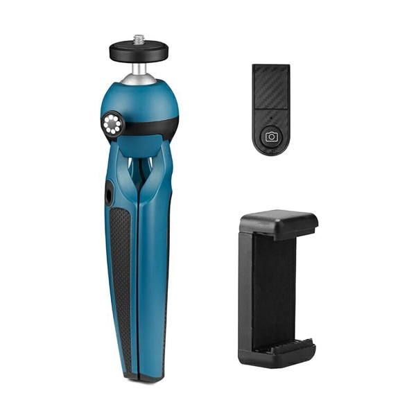 脚を閉じると握りやすいハンディーグリップになるミニ三脚「ハンディーポッド」に、スマートフォン用アダプターとBluetooth リモコンが付いたお得なキットです。